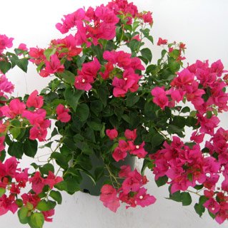 The vine species grow anywhere from 1 to 12 m (3 to 40 ft.) tall, scrambling over other plants with their spiky thorns. The thorns are tipped with a black, waxy substance. They are evergreen where rainfall occurs all year, or deciduous if there is a dry season. The leaves are alternate, simple ovate-acuminate, 4–13 cm long and 2–6 cm broad. The actual flower of the plant is small and generally white, but each cluster of three flowers is surrounded by three or six bracts with the bright colours associated with the plant, including pink, magenta, purple, red, orange, white, or yellow.