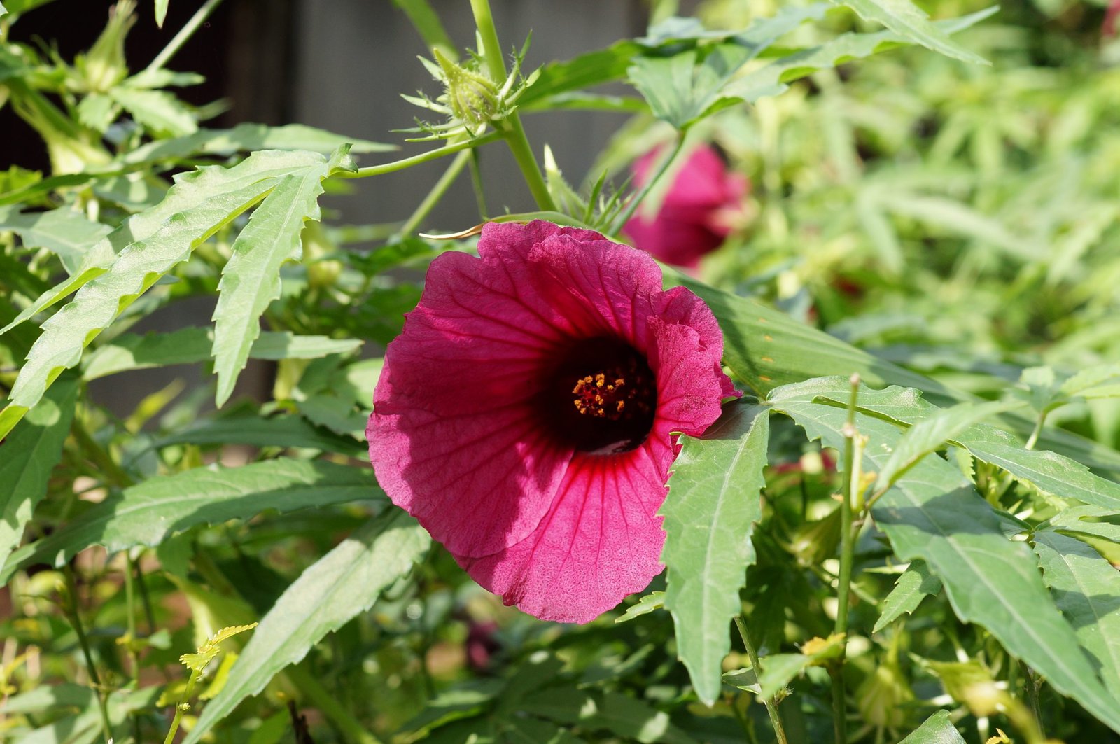 Hibiscus radiatus is native to southern and southeast Asia. It has 15 cm (5.9 in) mauve flowers that have a purple center and yellow anthers. Leaves are dentate, with upper leaves lobed into three, five, or seven parts. Leaves are mistaken as marijuana, but radiatus’ stems have small thorns. It is frequently grown as a vegetable or medicinal herb.